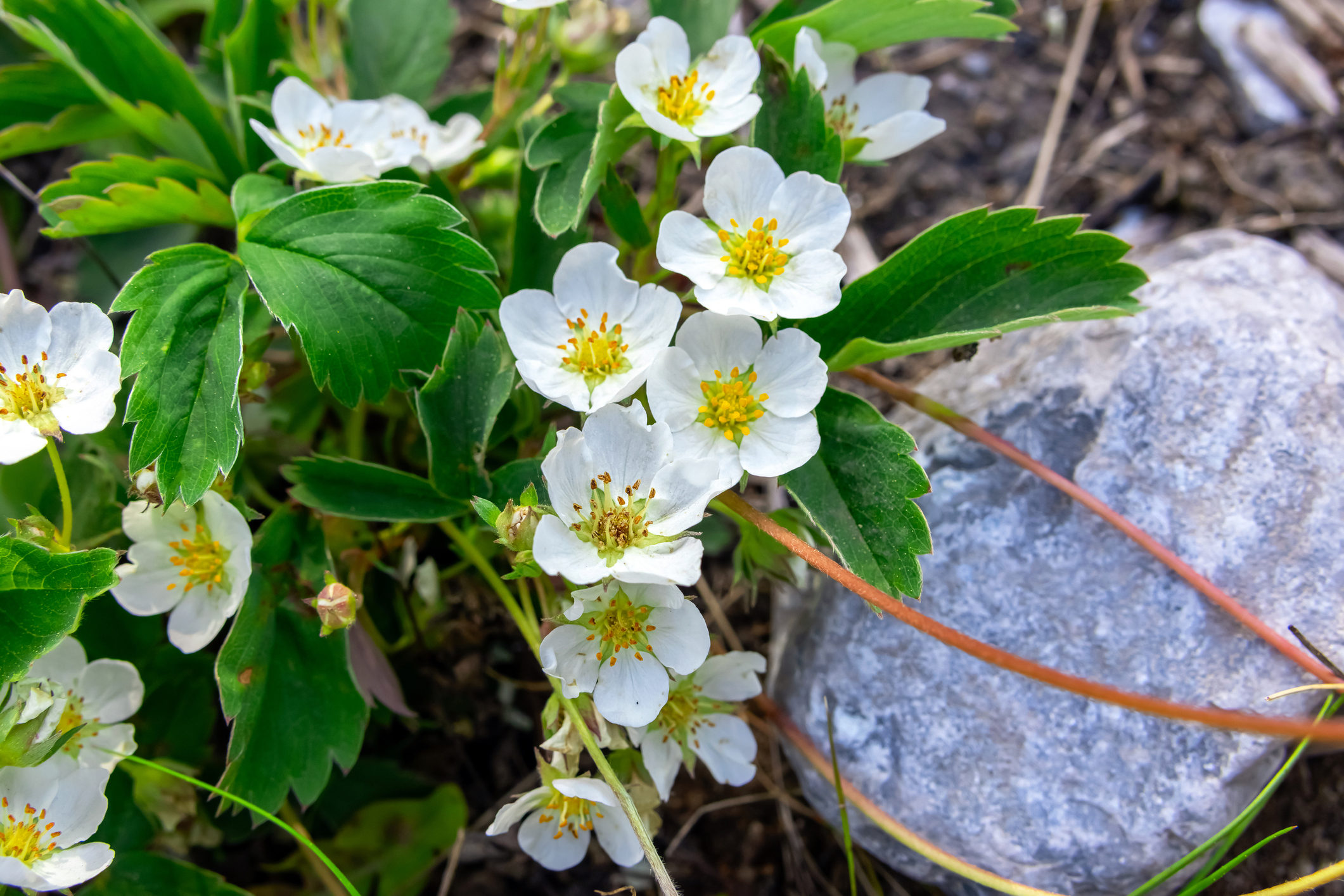 Canada has three species of native strawberries, all of which have white flowers that bloom typically between April to June. They are part of the rose family and have five white petals arranged radially around the centre which has many stamens, the part of the flower that bears pollen. Once pollinated, they form red fleshy fruit-like structures (commonly referred to as the fruit or berry) which have many small achenes – commonly but incorrectly referred to as the seeds. These structures are technically the fruit and contain the seed within! Wild strawberry plants are low to the ground, growing up to 15 to 25 cm high. They have trifoliate leaves, meaning they are divided into three leaflets, in this case, with toothed edges. Wild strawberries spread by sending out runners which grow along the ground and plant roots a distance away from the parent plant, anywhere from 15 to 50 cm.