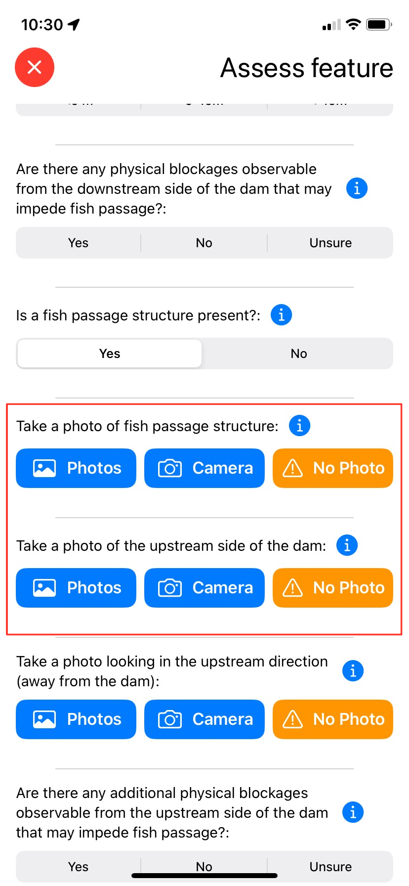 However, there is actually a way to indicate that there is a fish ladder. I’m not sure whether you are using the iOS or Android app, but you can see a screenshot here from the iOS app of the question asking whether there is a fish passage structure on the dam and then the option to take a picture of the fish passage structure.