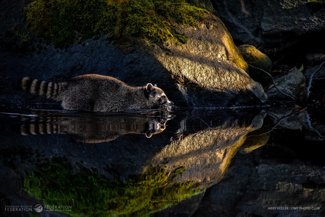 On her first visit to Stanley Park, Abby Keeler set out at sunrise hoping to photograph otters and beavers. After two hours of walking along the waterway, she spotted this Common Raccoon scavenging along the riverbed and spent the next hour quietly observing and taking photographs. For this shot, she lay down on a trail, hoping no one came along to disturb them. Observing wildlife has always been part of Keeler’s world – hours spent outdoors as a child turned into a daily ritual she eagerly embraced.