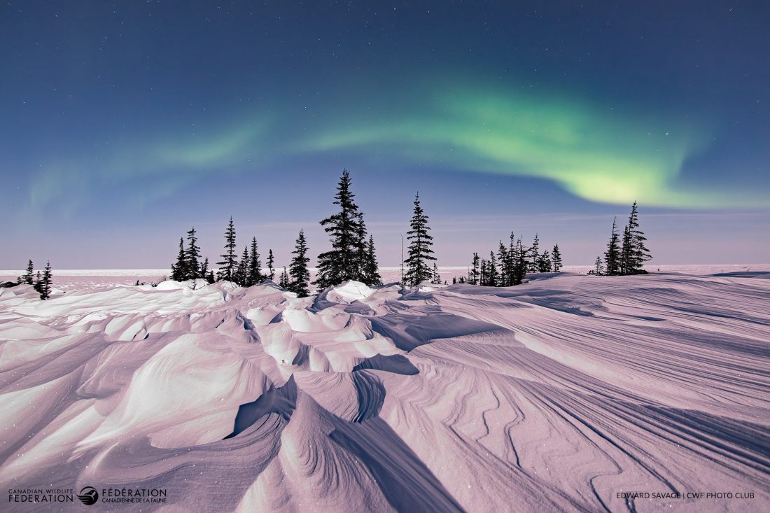 In the aftermath of a brutal blizzard, Edward Savage endured -40 °C temperatures for over three hours, waiting for the northern skies to light up with aurora borealis. With the moon at his back casting light across jagged snowdrifts, the scene unfolded: wind-carved ridges leading to a stand of spruce trees overlooking the vast, frozen expanse of Hudson Bay.