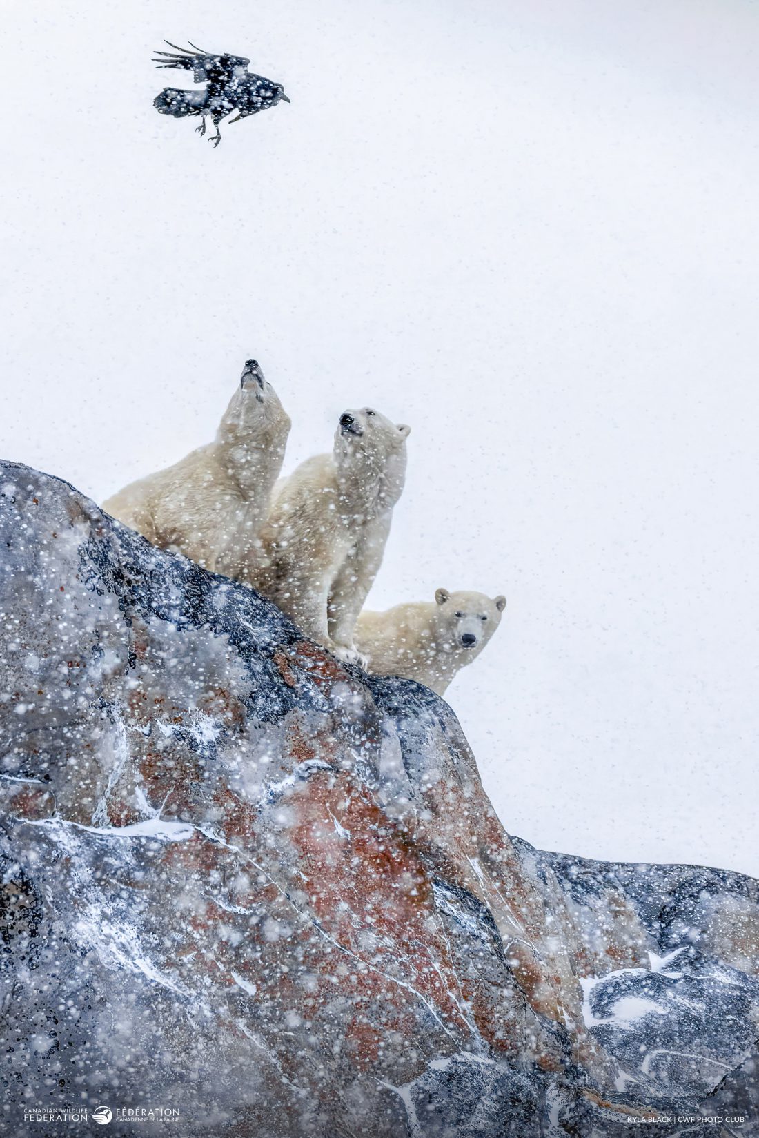 On a week-long trip to Churchill, Kyla Black watched as a female Polar Bear and her two cubs trudged across rocky terrain in a swirling snowstorm. Then, a Common Raven swooped in, diving low to tease the bears, only to lift away, just out of reach, at the last second, play a game of cat and mouse.