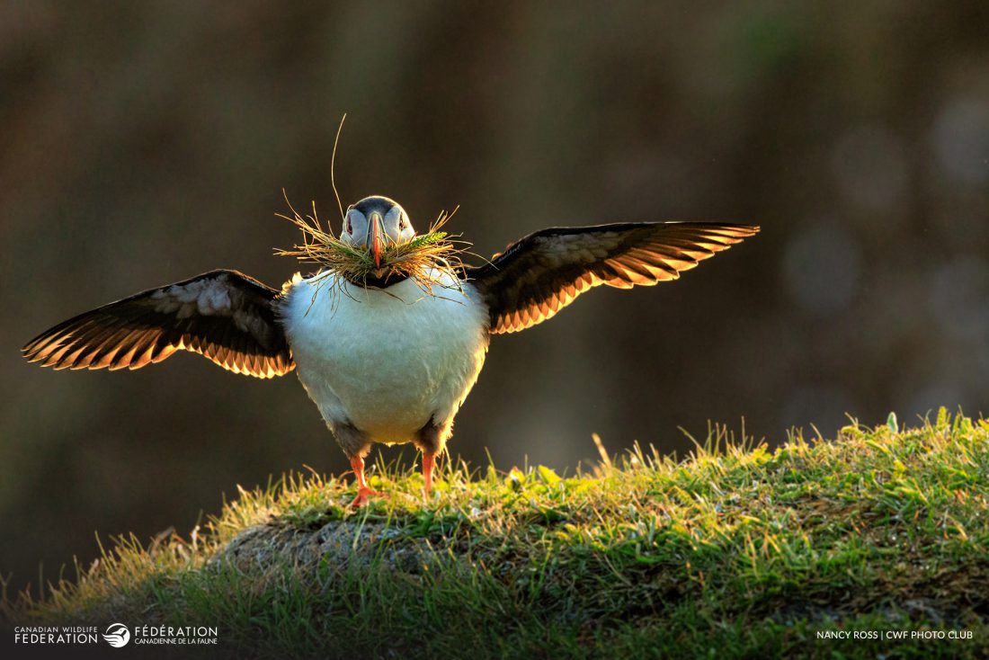 Nancy Ross has admired Atlantic Puffins for years and chose Elliston Island – one of North America’s best sites to observe these marine birds – for her dream shot.  Positioning herself near the cliff’s edge, she waited four hours for the perfect moment: a puffin landing at sunrise, wings outspread against a glowing sky, carrying nesting materials in its bill.