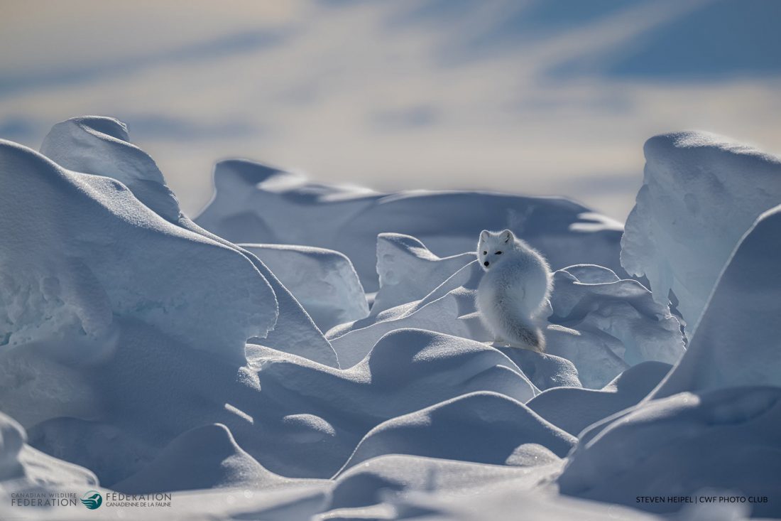 Far out on the frozen ocean of Baffin Bay, Steven Heipel traveled by snowmobile and qamutiik, hoping to glimpse Polar Bears. During a 10-day Arctic camping trip, Inuit guides paused at the base of this iceberg to harvest ice for fresh water. One guide spotted an Arctic Fox high on the ice and guessed its den was inside the iceberg.  While the group congregated at the far end of the iceberg, Heipel waited alone. The fox appeared in a well of sea ice, paused for a breath, then began zigzagging through the maze of fallen ice again. Whispering a plea for her to look back, Heipel got his wish – just once – capturing a glance and a puff of breath in the cold air.