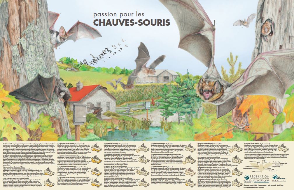 • Affiche « Passion pour les chauves-souris » – Cette affiche illustrée vous permet de découvrir les 19 espèces de chauves-souris indigènes du Canada, leur habitat et leur alimentation. Passez un moment en compagnie des gardiennes nocturnes de la nature!